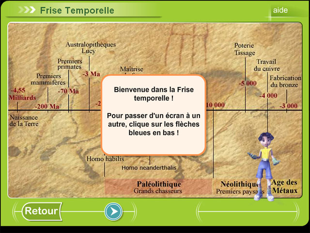 Ce logiciel couvre les périodes allant de l'origine de l'humanité à l'an 1 000 : Préhistoire, Égypte, Grèce, Rome, Gaule, Haut Moyen Age.