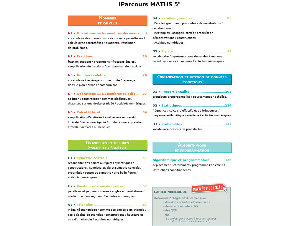 Le cahier iParcours Maths 5ème propose un grand nombre d'exercices de difficulté progressive pour accompagner l'élève pendant toute l'année scolaire.