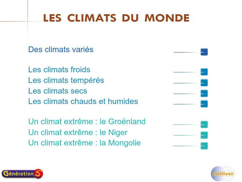 - Une présentation des grands types de climats : climat froid, climat tempéré, climat sec, climat chaud et humide.