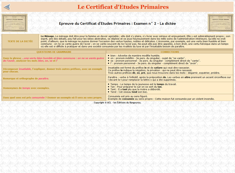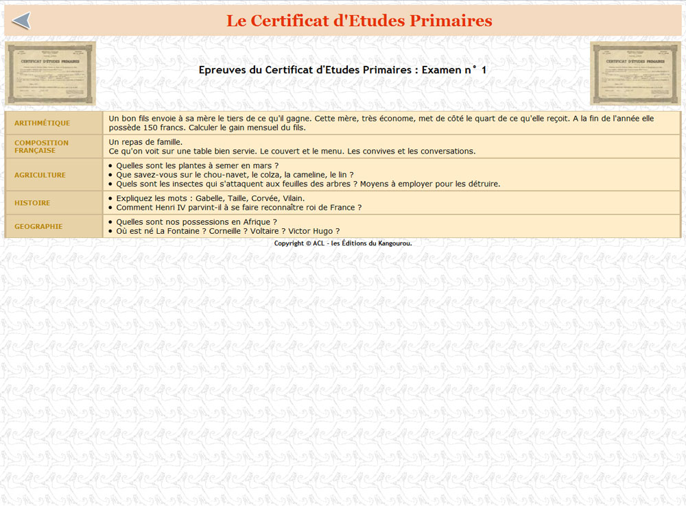 > Les épreuves du Certificat d'Études Primaires : arithmétique, dictée, composition française, agriculture, histoire, géographie, dessin...