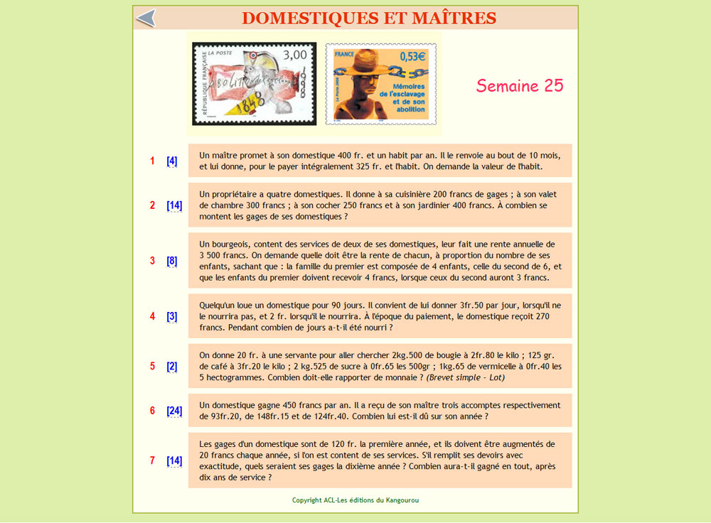 > Des exercices, avec leurs solutions, regroupés en thèmes parfois surprenants : les petits métiers, robinets et fontaines, engrais et fumures, maîtres et domestiques, système métrique, géographie, impôts et assurances, etc.