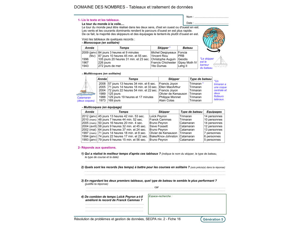 - Énoncés, tableaux, graphiques ; analyse de données et formulation de questions ; tableaux de proportionnalité et démarche ; échelles et traitement de données ; pourcentages et graphiques ; problèmes divers...