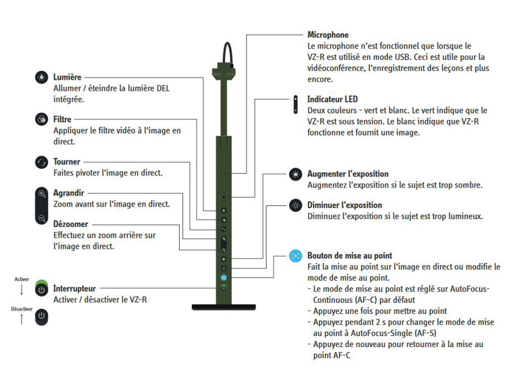 Les boutons accessibles sur le support permettent de paramétrer les images en temps réel (réglage de la luminosité, du exposition, zoom...).
