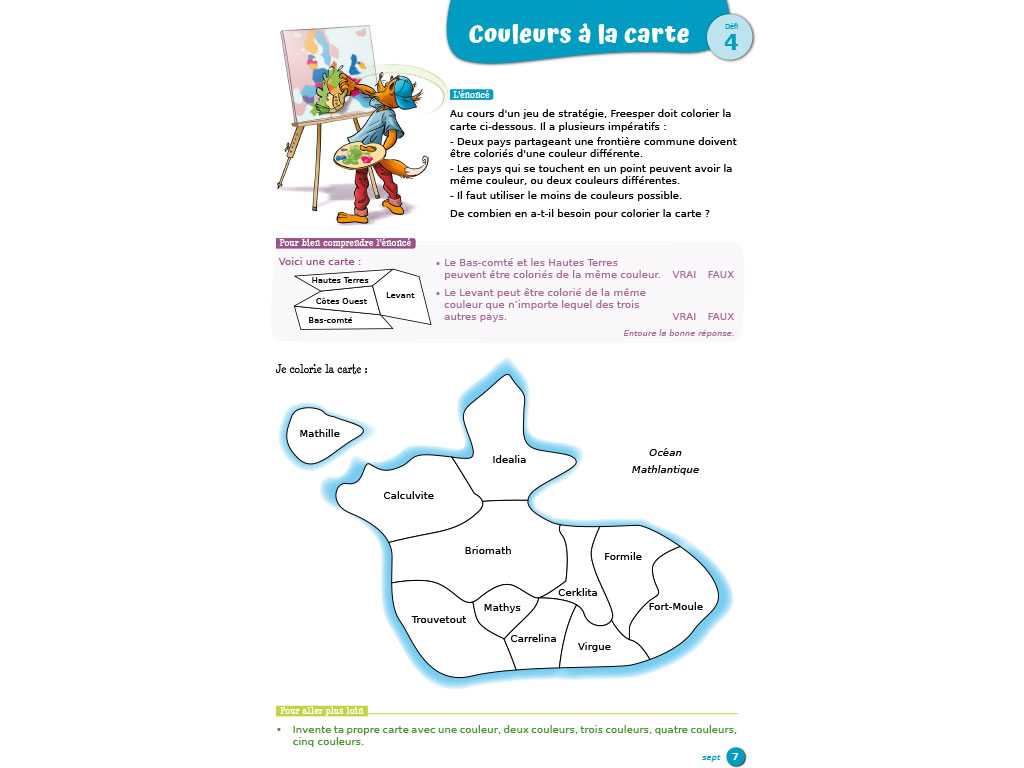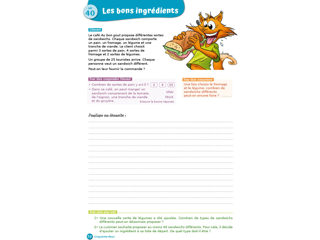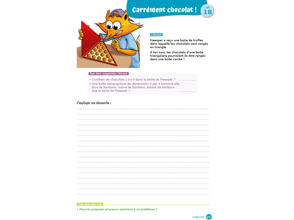 • Résolution de problèmes : 45 défis motivants à résoudre. Les énoncés, associés à une illustration, sont le point de départ d'une réflexion. Les élèves font des essais, conjecturent, testent... et explicitent leur démarche par écrit.