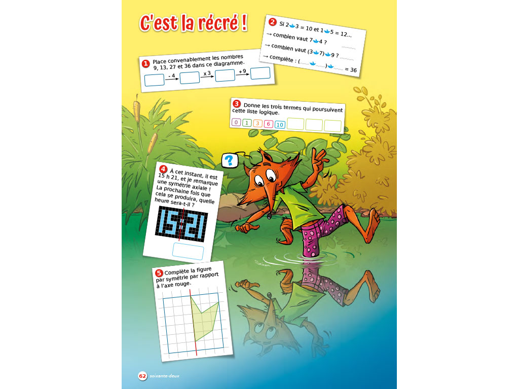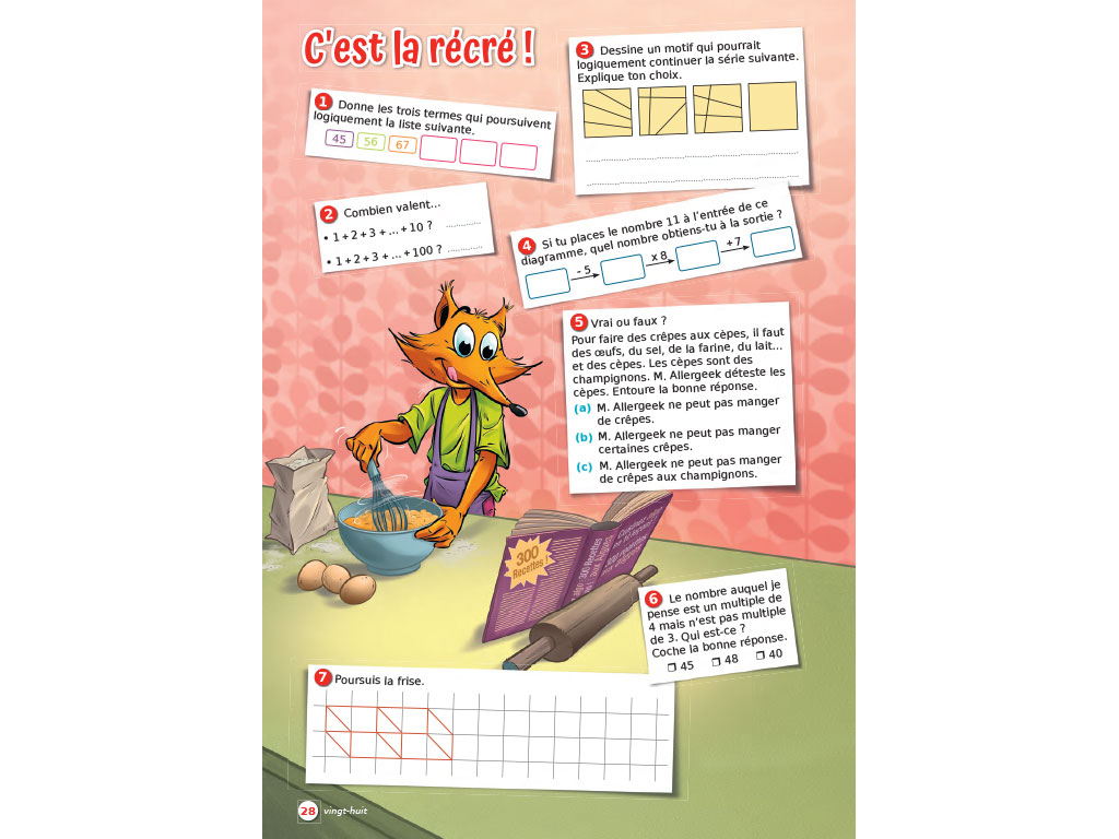 • Jeux mathématiques : 20 pages avec énigmes, messages cryptés, séries logiques, jeux de perspective, opérations codées, dessins à reproduire, intrus à trouver, diagrammes à compléter, etc.