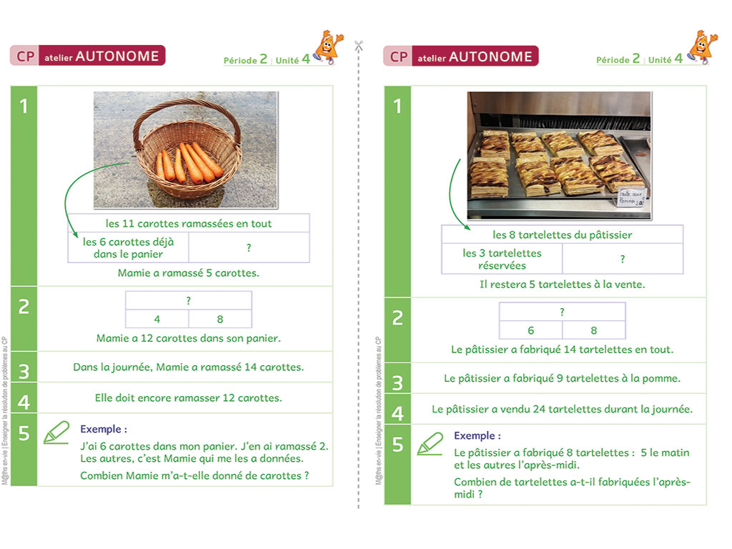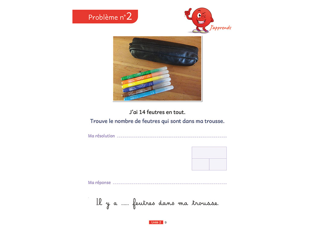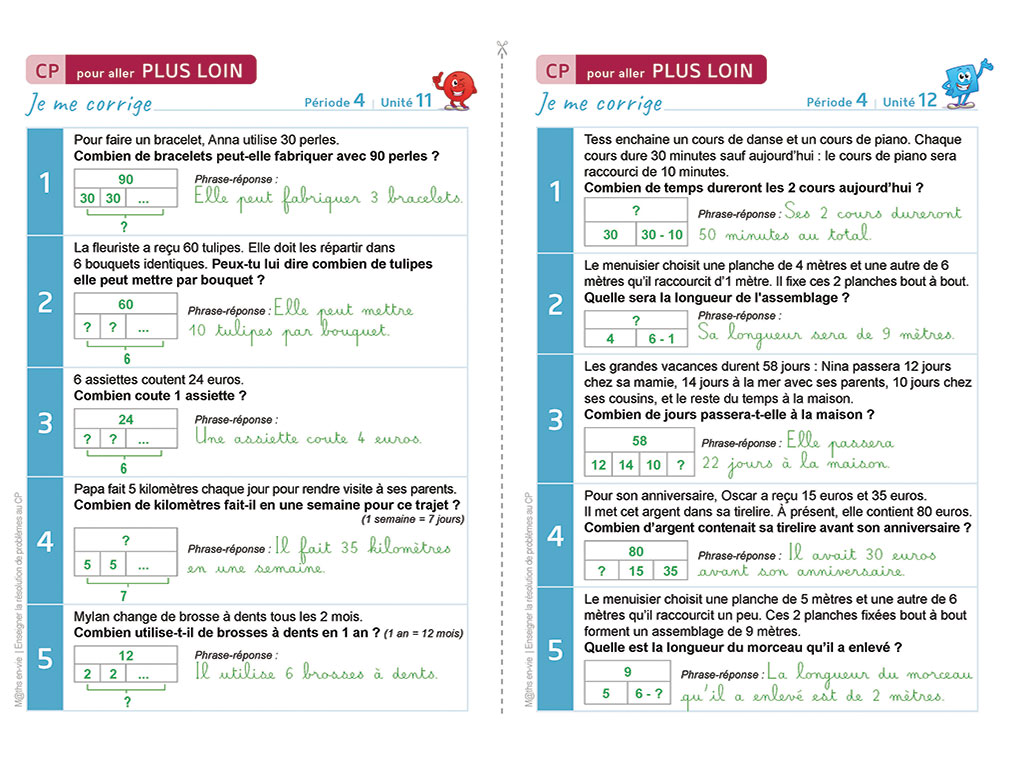 Il aborde, pour chaque période, un type particulier de problèmes (situation de réunion / partage, situation de transformation, etc.) dans 3 unités d’enseignement, avec des photo-problèmes pour l’apprentissage et des problèmes pour s’entrainer. Il permet aussi à l’élève de suivre ses progrès.