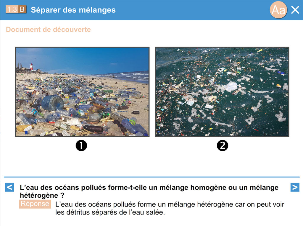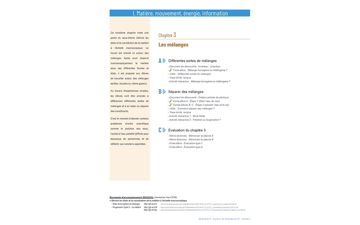 - La matière, le mouvement, l'énergie et l'information (Identifier un signal et une information / Propriétés et diversité de la matière / Les mélanges) ;