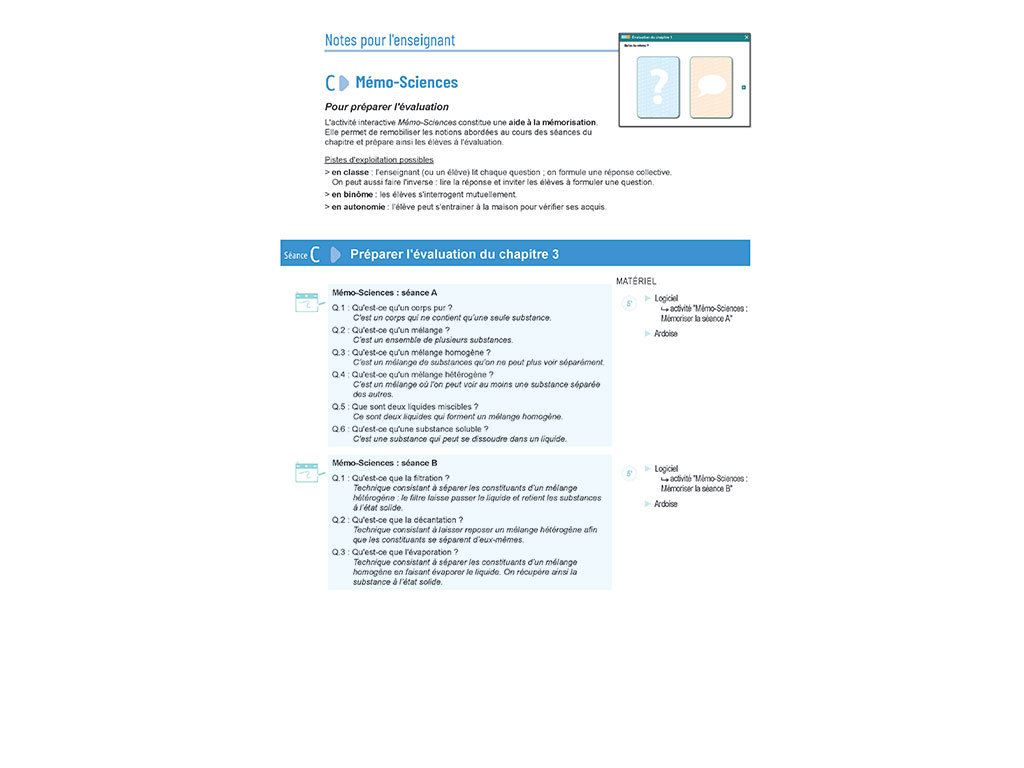 L'enseignant dispose de tous les éléments nécessaires pour mener à bien ses séances et proposer aux élèves une exploration des sciences d’une façon interactive, attractive et motivante.