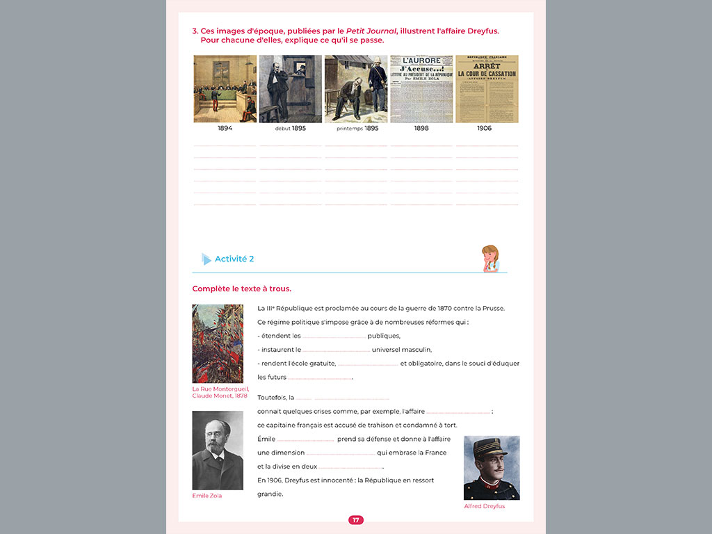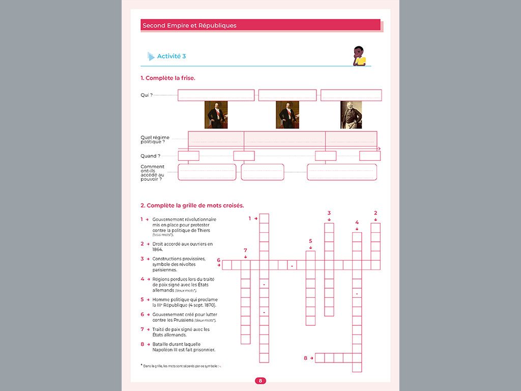 Le support papier est conçu pour rendre l'apprentissage de l'histoire motivant et stimulant, au travers d'exercices ludiques et variés et par une mise en page organisée, illustrée et aérée : textes à trous, QCM, mots croisés, questions-réponses, coloriage, schémas et frises à compléter, etc.