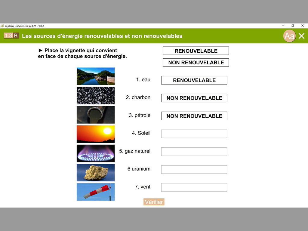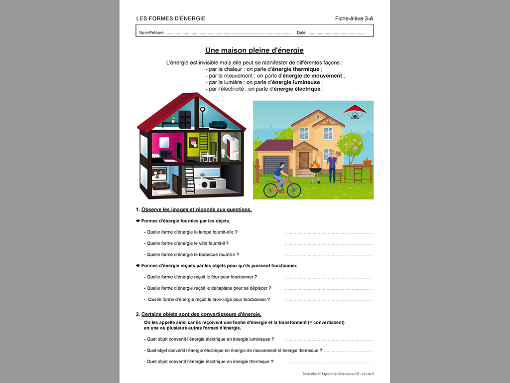 • La matière, le mouvement, l'énergie et l'information (description du mouvement d'un objet, sources et formes d'énergie, sources d’énergie renouvelables et non renouvelables) ;