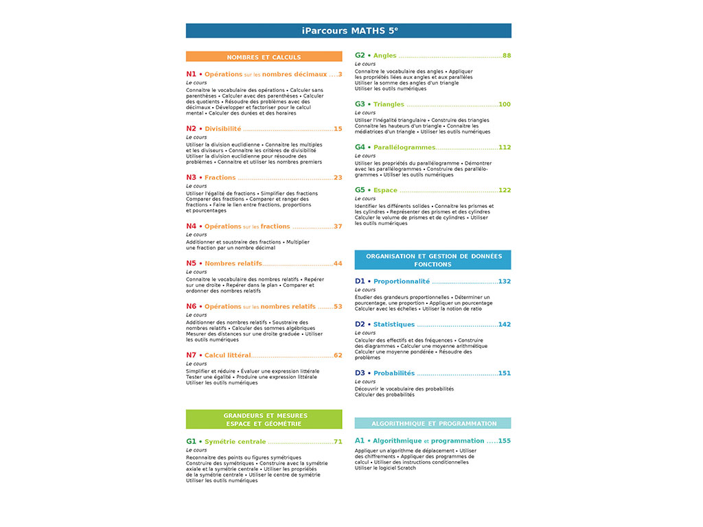 Sommaire du Cahier d'exercices iParcours 5e avec cours