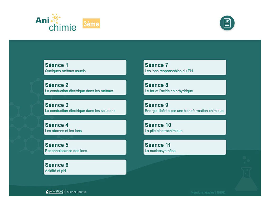 Aniphysique - Anichimie 3e est un outil numérique éducatif en ligne (abonnement annuel) destiné aux élèves et aux professeurs de Physique - Chimie de niveau 3e.